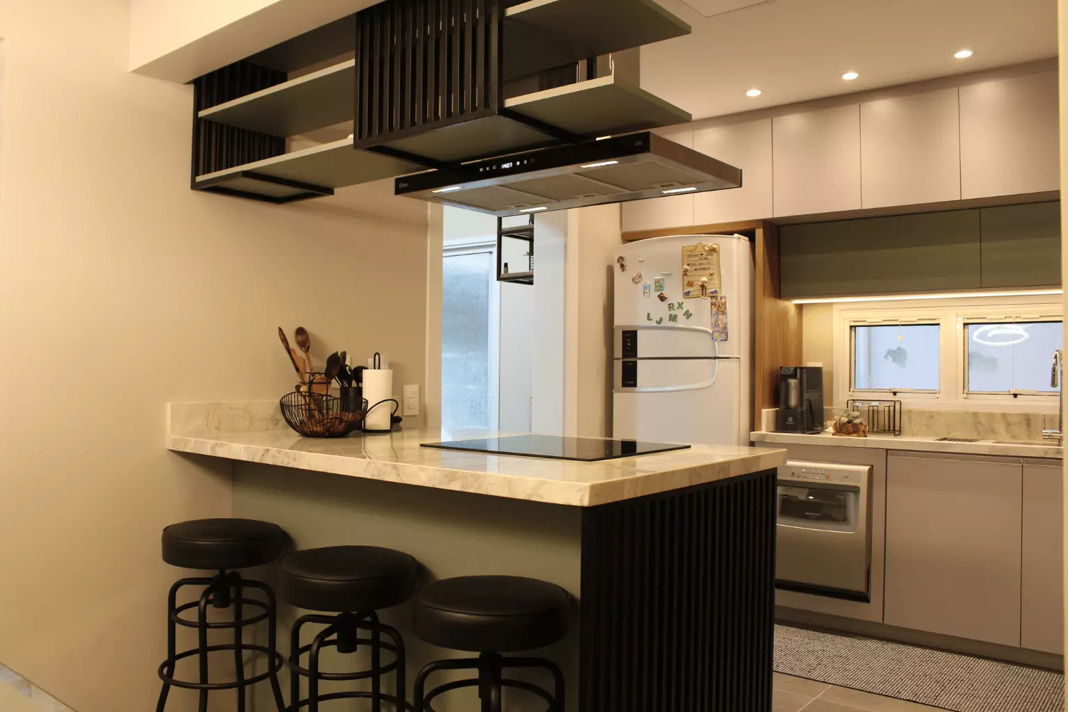 Projeto e execução de cozinha planejada em MDF Branco Tx, com porta de vidro reflecta bronze. Um ótimo